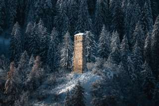 Markante Turmruine zwischen Clugin und Andeer, auf einem felsigen Sporn auf der linken Talseite des Schams.