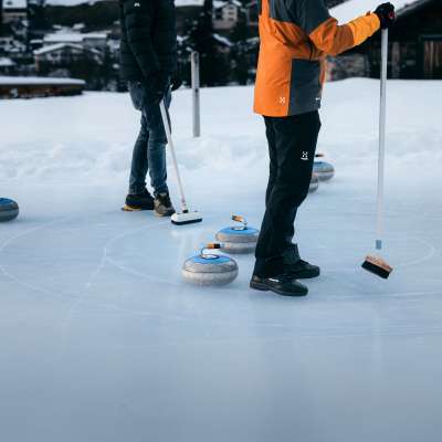 Der Curling Club Splügen präpariert bei entsprechenden Temperaturen jeweils zwei Curling-Bahnen, welche als Gruppe gemietet werden können.