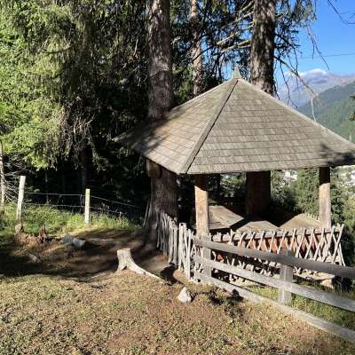 Die Feuerstelle Pavillon/Panell liegt ca. 160 Meter über dem Talboden. Eine gute Aussicht hat man auf das Dorf Splügen und das Rheinwald.