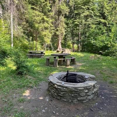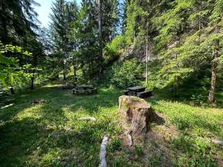 Die Feuerstelle liegt geschützt im Wald, direkt an einem kleinen See und Bächlein.