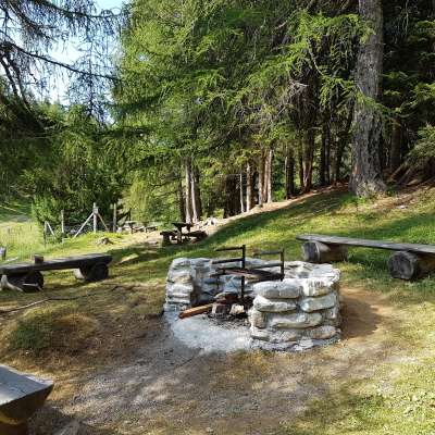 In der Mitte des Dorfes Feldis geht der Weg hoch Richtung Dreibündenstein. Nach ca. 1 Kilometer und 100 Höhenmetern erreichen Sie die Feuerstelle.
