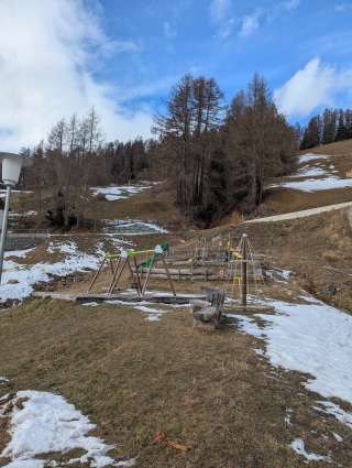 Der Spielplatz befindet sich direkt beim grossen Parkplatz in Mathon, neben dem Feuerwehrdepot.