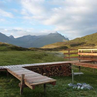 Es gibt keine Bänke direkt an der Feuerstelle.