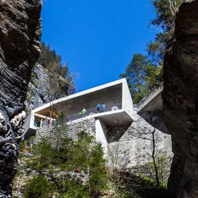 Ein leicht asymmetrisches Gibeldach aus Sichtbeton überspannt die rund 40m2 Verkaufsfläche. Während der Bau zur Strasse und zur Schlucht hin geschlossen wirkt, ist die Süd- und Nordseite des mit einheimischem Holz ausgebauten Innenraums mit grossflächigen Fenstern versehen. Die Besucher gelangen neu durch den Shop hindurch an der Kassa vorbei über die ausgesetzte Treppe nördlich des Gebäudes in die Schlucht. Der Weg führt im Untergeschoss durch einen Ausstellungsraum. Von dort wird man auf die im Jahre 1903 erbaute Treppenanlage geführt, über welche die Schluchtbesucher nach dem Rundgang wieder zum Shop und zur neuen Besucherterrasse gelangen. Die Viamala-Schlucht ist mit jährlich rund 60'000 zahlenden Besuchern Aushängeschild und tragende wirtschaftliche Säule im regionalen Tourismus. Entsprechend waren bei der Planung und der Umsetzung des Bauprojektes die Verbesserung der Orientierung und der Aufenthaltsqualität für den Gast massgebende Maximen. So entwickelte eine Fachgruppe unter Beizug von Dr. Roland Scheurer, einem ausgewiesenen Fachmann im Bereich touristischer Angebotsentwicklung, parallel zum Bauprozess ein modulares Konzept, das sich auf die archaische Natur als Kernwert der Viamala fokussiert. Die Schluchtbesucher werden bewusst nicht mit Informationen überhäuft, sondern subtil aufgefordert, das Szenario vor Ort mit all ihren Sinnen wahrzunehmen.